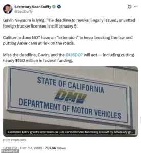 The state argued that the extension would allow drivers to continue working ‘to serve our communities,’ a statement that Duffy dismissed as a ‘lie’ and a dangerous attempt to circumvent federal authority.