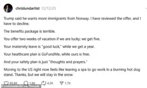 Lund, who posted his reply on Threads, humorously declined Trump’s “invitation,” highlighting stark differences between the United States and Norway’s social welfare systems. “The benefits package is terrible.