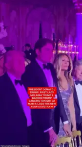 At a New Year’s Eve party at Mar-a-Lago last week, he was seen standing between his parents at a table, his expression muted as ‘Ice Ice Baby’ played in the background.