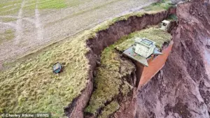 The relentless advance of the sea has reduced the bunker’s distance from the cliff’s edge from 100 yards to just 25 feet, a change that has accelerated in recent years due to climate change and rising sea levels. ‘The erosion here is relentless,’ said a spokesperson for the East Riding Council. ‘We’ve seen the land retreat by meters each year, and the bunker is just one of many structures at risk.’
