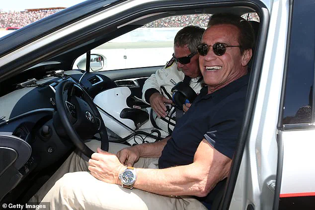 Actor and former governor of California Arnold Schwarzenegger poses for a photo before driving the 2016 Toyota Mirai pace car