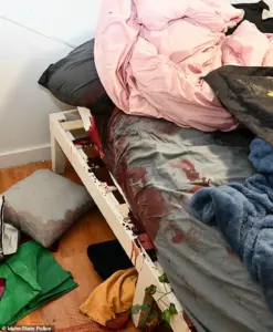 The photographs revealed the horror in stark detail: rips in the mattress suggesting a desperate struggle, overturned furniture, and a bedroom that had become a site of unspeakable violence.