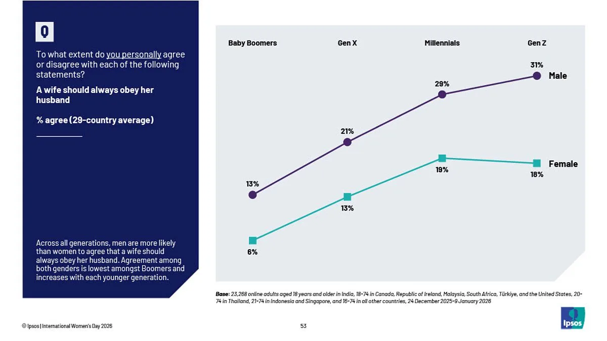 Researchers from King's College London conducted the analysis, surveying 23,000 individuals across 29 countries. The data highlighted a stark generational divide in attitudes toward gender roles. While only 13% of Baby Boomer men agreed with the notion of a wife's absolute obedience, 31% of Gen Z men did. The study also found that 18% of Gen Z women and 6% of Boomer women shared this view, underscoring a complex interplay of societal expectations and personal beliefs.