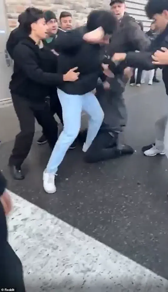 The footage, which has since gone viral, shows a group of young men throwing punches and pulling one another to the ground.